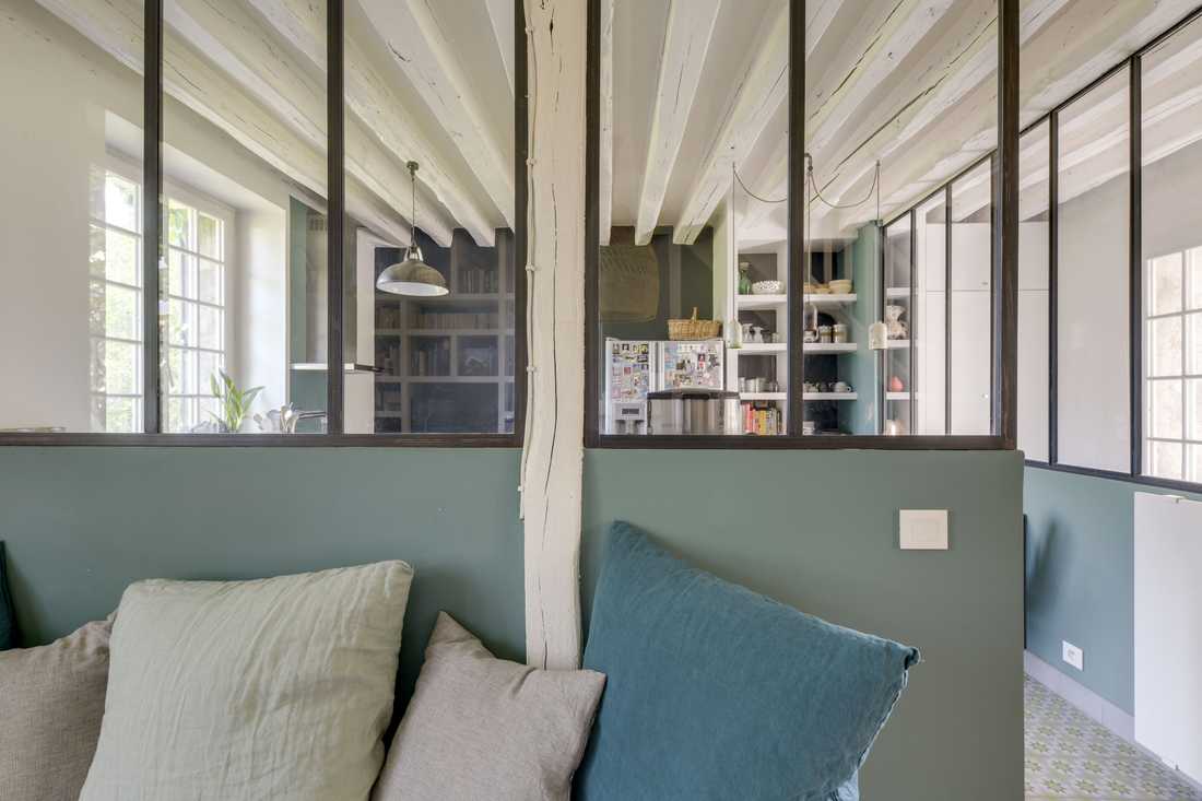 Le couple souhaitait une cuisine semi-ouverte, sans cloisonner afin de laisser passer la lumière dans toute la pièce à vivre. Des verrières en métal, évoquant les vieux ateliers parisiens, ont donc été dessinées par l’architecte d’intérieur avant d’être réalisées sur mesure par un ferronnier.